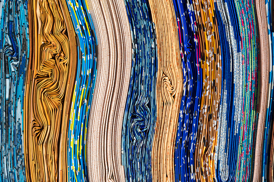 A pile of fabrics at the Medina Market in Accra. Markets feature an abundance of vibrant colors found in produce and home decor.
