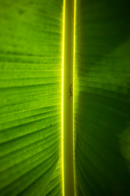 Sunlight illuminates the inside of a plantain leaf.