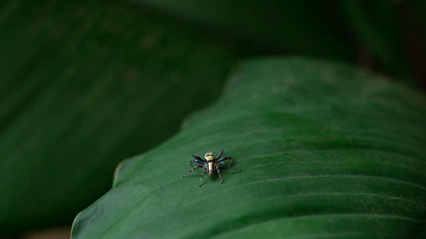 A spider enjoys the shade provided by this plant at a flower shop.