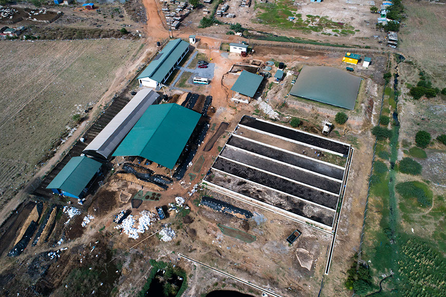 Walking through the rows of compost production piles a worker at Safisana checks for a pile that is ready to be bagged.
