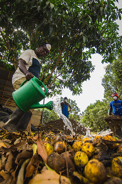 One of the workers at the UOWAIP farm pours water onto the new pile of compost. Mixing water and sawdust into the rotting fruits and vegetables helps to speed the process of composting.