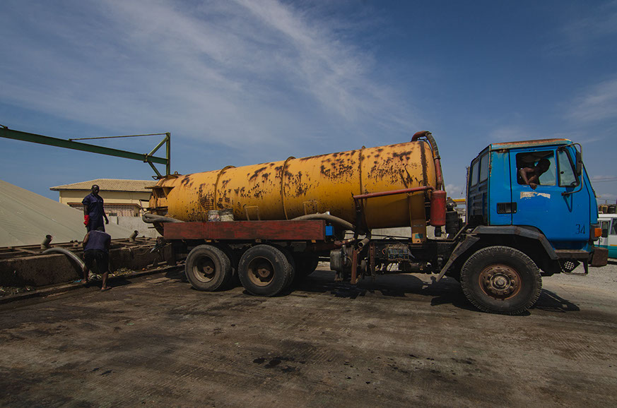 A sewage truck unloads its tank at the Bola Boden waste treatment facility in Accra, Ghana. The water is treated at the facility and the sludge from the tanks is turned into compost.