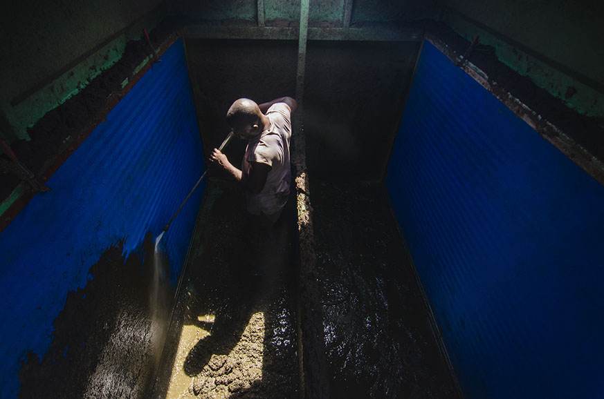 Inside of the eight tanks on site at Bola Boden, a worker pressure washes out human waste to prepare it for the next cycle of treatment.