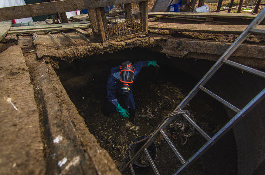 Inside the wastewater drainage tank, a worker loads up large debris from the sludge in preparation for its pumping into the holding tank.