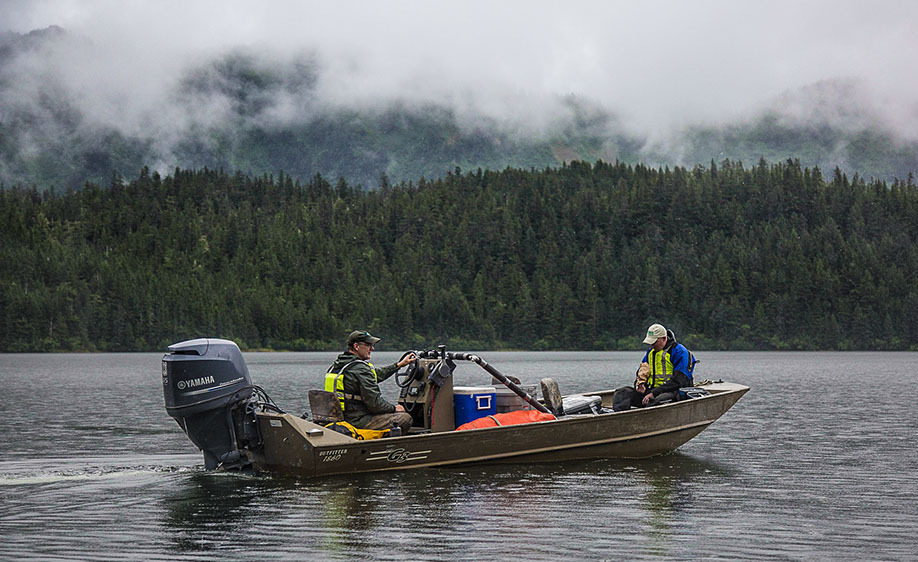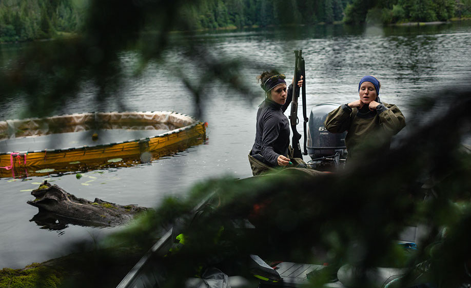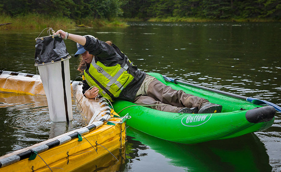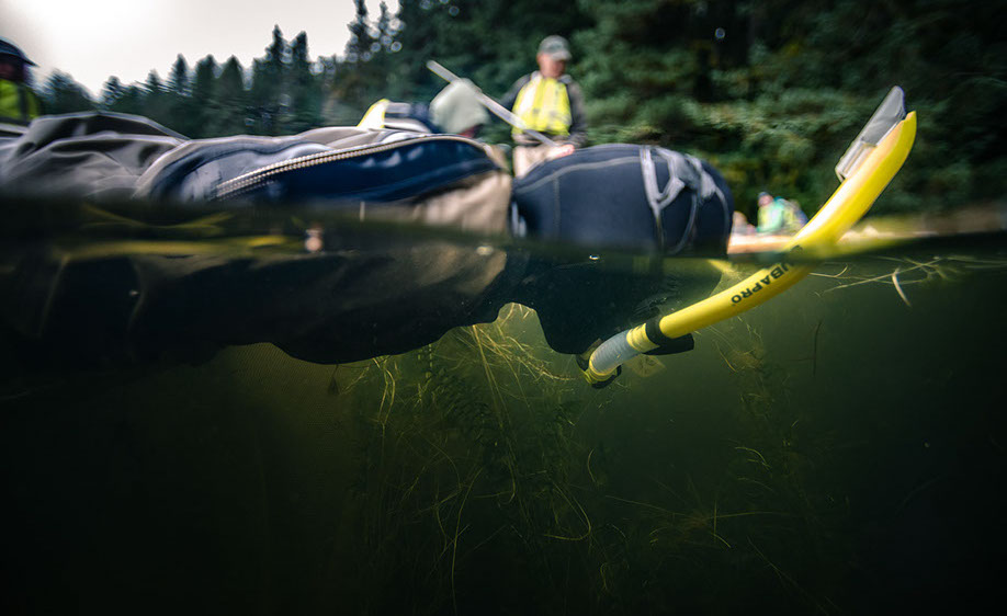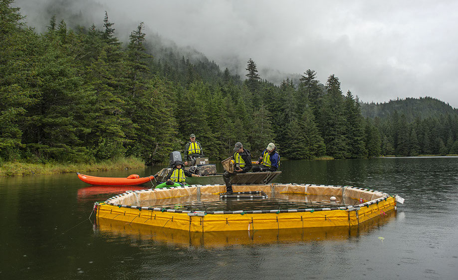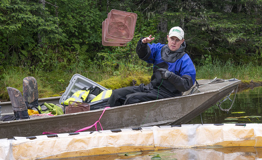 by Emily Goodykoontz | photos by Justin Hartney, Jessica Smith, Abigail Winn, Tim Vandehey, Cameron Shultz, & Emily Goodykoontz When fish biologist Mike Carey moved to Alaska six years ago to do research with the U.S. Geological Survey, not many scientists were worried about invasive species infiltrating the aquatic and terrestrial landscapes of Alaska. “That has changed dramatically in the last five years or so,” said Carey. An invasive species is a term for non-native plants, animals and other organisms that alter or damage the new ecosystems they enter. Carey has spent much of his career studying invasive species in aquatic systems like lakes and rivers. In Alaska, he’s focusing on the biggest invasive threat to the native water ecosystems – Elodea. “Everybody is worried about Elodea. There’s a lot of people studying it, there’s a lot of money to understand what it’s doing, how to get rid of it.” Elodea is the genus name for six similar aquatic plants, also known as waterweed. Popularly used in aquariums and science classrooms, it is the first known aquatic plant species to successfully broach Alaskan waters – an invader in complex thriving native fisheries and ecosystems. For most of its history, Alaska was protected by the nature of its remoteness and by environmental conditions too harsh for most invasive species to take hold. But as human commercial and recreational activities continue to grow, as the global climate warms and conditions in Alaska change, scientists are scanning the proverbial horizons for invasive species encroaching from latitudes further south. “Elodea is an amazingly hearty plant. It’s growing when it’s freezing out under the ice,” said Carey. “It can survive desiccation for a long time, so it could get hooked on a rudder of a float plane and easily get moved to another area.” In a parallel effort, researchers with the U.S. Forest Service and U.S. Geological survey are working to build the scientific community’s understanding of Elodea’s effects on native food webs. And they’re keeping keen eyes on Elodea’s effect on salmon growth – salmon are Alaska’s biggest fishery and pulled in a $678 million ex-vessel value in 2017. Elodea was first noticed in Eyak Lake in 1982, on the southeast coast of Alaska. Since then, its spread across several parts of the Copper River Delta, which is the largest contiguous wetland complex on North America’s Pacific coast. It’s also been found in lakes near Fairbanks and Anchorage. Crucial salmon, encroaching species It’s mid-August, and Carey is up to his neck in the frigid, green water of McKinley Lake, leaning on his elbows over a large floating yellow ring. Above him, white mist obscures the tops of dense spruce and hemlock, the dark green mountainsides of the Chugach National Forest rising steep above the shoreline. Carey’s gaze is focused on the waters below, searching for the flitting silver movements of the juvenile Coho salmon swimming inside a yellow limnocorral, which looks like a floating swimming pool. It is collection day, and Carey will take the Coho back to his lab in Anchorage at the USGS Alaska Science Center(check) to measure their growth. The limnocorrals function as a contained environment for salmon and other aquatic organisms growing in them. Carey, the lead investigator on the project, needs these controlled environments to conduct the experiment. Mesh sleeves fall to the bottom of the lake from the floating yellow ring, keeping some vegetation and critters in, and others out. They are set up in three pairs around the lake – a total of six – one each dominated 80 percent or more by Elodea as aquatic vegetation, and the other containing mostly native aquatic plants. Carey hopes to better understand the effects of Elodea on the native aquatic ecosystem. “While it would be great to get rid of this species, it’s here, so I think we need to understand what it’s doing to the community, understand how it functions in the food web, to get a better understanding of what that impact is going to be,” said Carey. For two years plus a trial first year, Carey and a team of fish biologists and graduate students have returned to McKinley Lake each summer to run the experiment. This is the final leg – and he hopes it will provide enough statistical power to give them a clear understanding of Elodea’s place in the food web. “That’s the goal of the limnocorrals,” said Carey. “To create this controlled environment where we know what’s happening there, so we can do a comparison between these littoral food webs, with and without Elodea in there, to understand that bottom-up effect.” A littoral food web is the chain of who-eats-who or what-eats-what in an aquatic system. It’s the basic circuitry of energy in the system, the interconnections between organisms that dictate how any ecosystem functions, interacts, grows and changes. “We are trying to understand how the different components of the food web are changing, ultimately trying to understand how it influences fish growth and fish condition,” he said. Carey is focusing on Elodea impacts to the growth of young Coho salmon in comparison to Coho rearing among native plants. At the beginning of the summer, he stocked the limnocorrals with juvenile fish that he had soaked in a blue dye, a stable isotope that gets absorbed by structures made of calcium in their bodies. He removes a small, oval bone from the ear of the salmon and measures them like the rings of a tree – the dye leaves a tiny blue ring in the bone growth. “When I look at the otolith under the microscope, I can see exactly when we put that fish in,” Carey said. “And then the otolith is going to continue to grow throughout the summer, so I can measure the rest of that growth from that moment in time.” But he’s not just measuring rings on fish bones. He’s paying attention to their food sources, too. He counts macroinvertebra