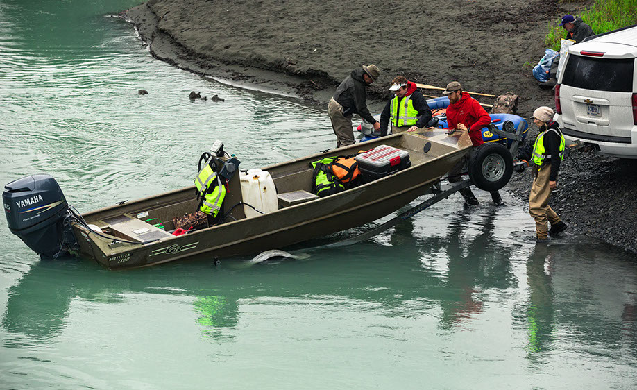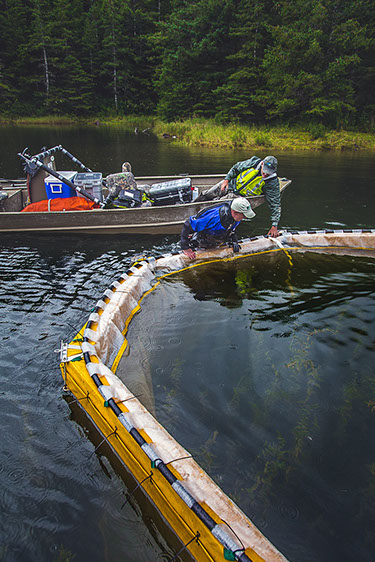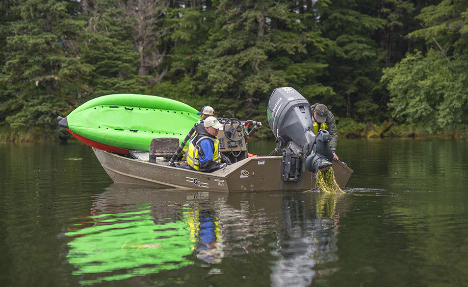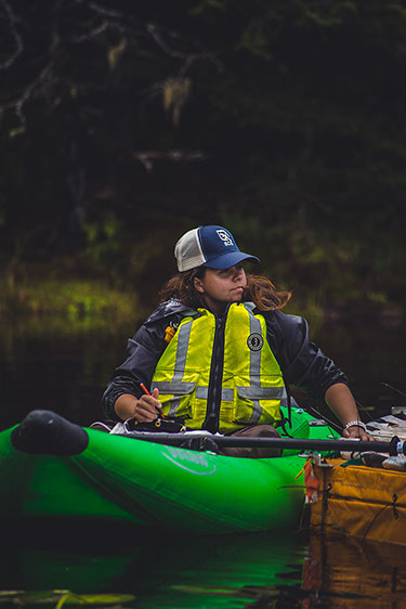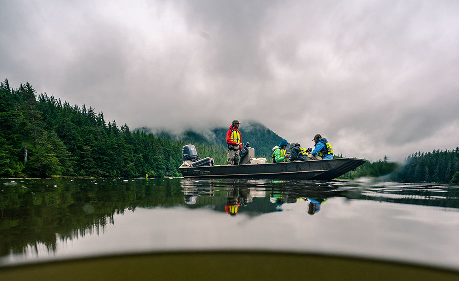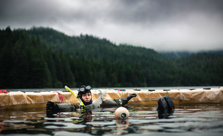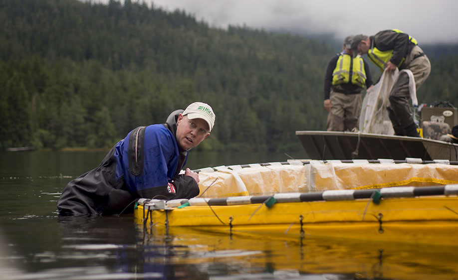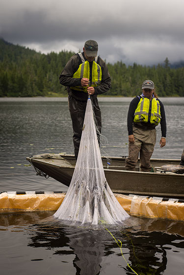 by Emily Goodykoontz | photos by Justin Hartney, Jessica Smith, Abigail Winn, Tim Vandehey, Cameron Shultz, & Emily Goodykoontz When fish biologist Mike Carey moved to Alaska six years ago to do research with the U.S. Geological Survey, not many scientists were worried about invasive species infiltrating the aquatic and terrestrial landscapes of Alaska. “That has changed dramatically in the last five years or so,” said Carey. An invasive species is a term for non-native plants, animals and other organisms that alter or damage the new ecosystems they enter. Carey has spent much of his career studying invasive species in aquatic systems like lakes and rivers. In Alaska, he’s focusing on the biggest invasive threat to the native water ecosystems – Elodea. “Everybody is worried about Elodea. There’s a lot of people studying it, there’s a lot of money to understand what it’s doing, how to get rid of it.” Elodea is the genus name for six similar aquatic plants, also known as waterweed. Popularly used in aquariums and science classrooms, it is the first known aquatic plant species to successfully broach Alaskan waters – an invader in complex thriving native fisheries and ecosystems. For most of its history, Alaska was protected by the nature of its remoteness and by environmental conditions too harsh for most invasive species to take hold. But as human commercial and recreational activities continue to grow, as the global climate warms and conditions in Alaska change, scientists are scanning the proverbial horizons for invasive species encroaching from latitudes further south. “Elodea is an amazingly hearty plant. It’s growing when it’s freezing out under the ice,” said Carey. “It can survive desiccation for a long time, so it could get hooked on a rudder of a float plane and easily get moved to another area.” In a parallel effort, researchers with the U.S. Forest Service and U.S. Geological survey are working to build the scientific community’s understanding of Elodea’s effects on native food webs. And they’re keeping keen eyes on Elodea’s effect on salmon growth – salmon are Alaska’s biggest fishery and pulled in a $678 million ex-vessel value in 2017. Elodea was first noticed in Eyak Lake in 1982, on the southeast coast of Alaska. Since then, its spread across several parts of the Copper River Delta, which is the largest contiguous wetland complex on North America’s Pacific coast. It’s also been found in lakes near Fairbanks and Anchorage. Crucial salmon, encroaching species It’s mid-August, and Carey is up to his neck in the frigid, green water of McKinley Lake, leaning on his elbows over a large floating yellow ring. Above him, white mist obscures the tops of dense spruce and hemlock, the dark green mountainsides of the Chugach National Forest rising steep above the shoreline. Carey’s gaze is focused on the waters below, searching for the flitting silver movements of the juvenile Coho salmon swimming inside a yellow limnocorral, which looks like a floating swimming pool. It is collection day, and Carey will take the Coho back to his lab in Anchorage at the USGS Alaska Science Center(check) to measure their growth. The limnocorrals function as a contained environment for salmon and other aquatic organisms growing in them. Carey, the lead investigator on the project, needs these controlled environments to conduct the experiment. Mesh sleeves fall to the bottom of the lake from the floating yellow ring, keeping some vegetation and critters in, and others out. They are set up in three pairs around the lake – a total of six – one each dominated 80 percent or more by Elodea as aquatic vegetation, and the other containing mostly native aquatic plants. Carey hopes to better understand the effects of Elodea on the native aquatic ecosystem. “While it would be great to get rid of this species, it’s here, so I think we need to understand what it’s doing to the community, understand how it functions in the food web, to get a better understanding of what that impact is going to be,” said Carey. For two years plus a trial first year, Carey and a team of fish biologists and graduate students have returned to McKinley Lake each summer to run the experiment. This is the final leg – and he hopes it will provide enough statistical power to give them a clear understanding of Elodea’s place in the food web. “That’s the goal of the limnocorrals,” said Carey. “To create this controlled environment where we know what’s happening there, so we can do a comparison between these littoral food webs, with and without Elodea in there, to understand that bottom-up effect.” A littoral food web is the chain of who-eats-who or what-eats-what in an aquatic system. It’s the basic circuitry of energy in the system, the interconnections between organisms that dictate how any ecosystem functions, interacts, grows and changes. “We are trying to understand how the different components of the food web are changing, ultimately trying to understand how it influences fish growth and fish condition,” he said. Carey is focusing on Elodea impacts to the growth of young Coho salmon in comparison to Coho rearing among native plants. At the beginning of the summer, he stocked the limnocorrals with juvenile fish that he had soaked in a blue dye, a stable isotope that gets absorbed by structures made of calcium in their bodies. He removes a small, oval bone from the ear of the salmon and measures them like the rings of a tree – the dye leaves a tiny blue ring in the bone growth. “When I look at the otolith under the microscope, I can see exactly when we put that fish in,” Carey said. “And then the otolith is going to continue to grow throughout the summer, so I can measure the rest of that growth from that moment in time.” But he’s not just measuring rings on fish bones. He’s paying attention to their food sources, too. He counts macroinvertebra