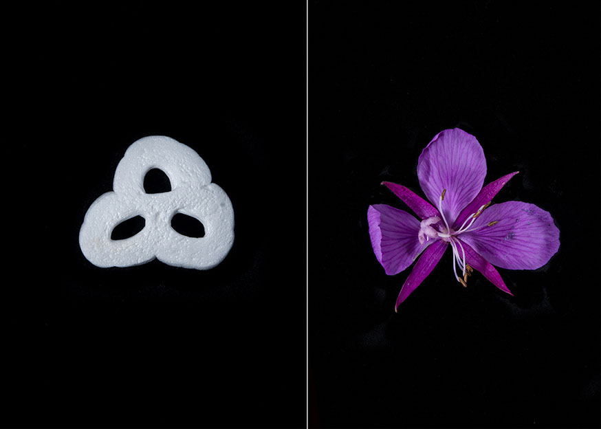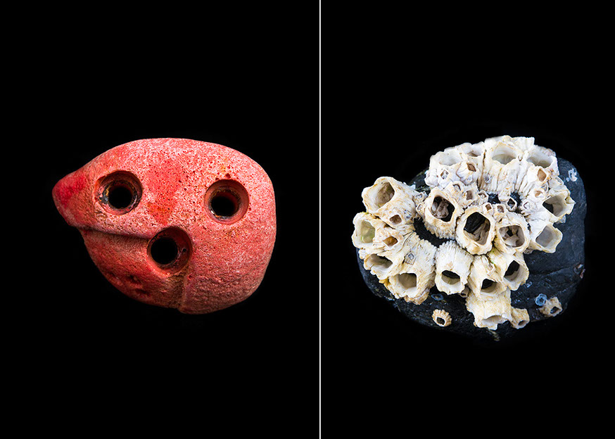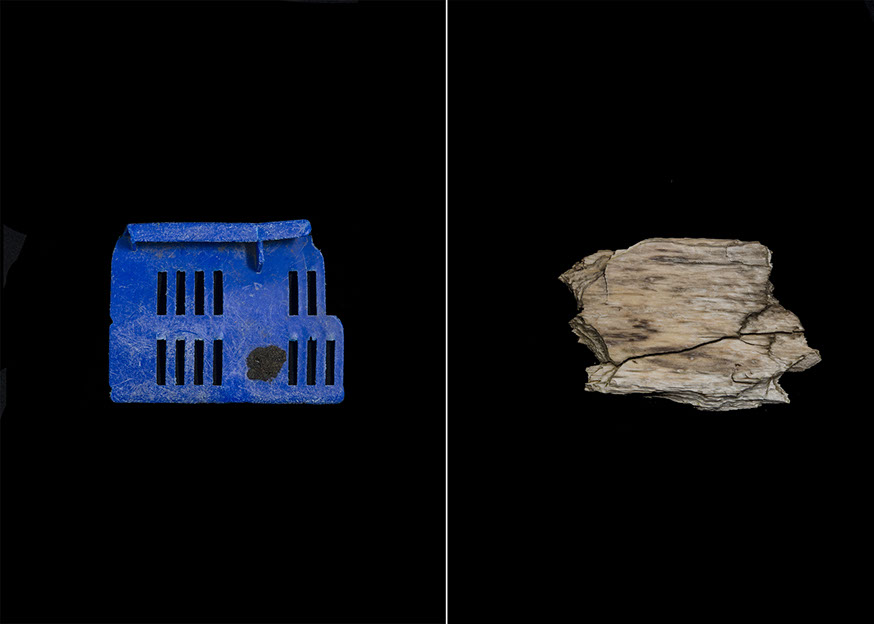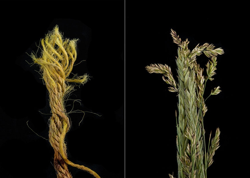 A small piece of blue cord is broken off from the larger net. These ghost nets can entangle and trap any marine animal including sharks, turtles, and dolphins. The sharp material of the nets can lacerate the bodies of marine animals and can drown others that need to surface for air. A sprig of common horsetail, or Equisetum Arvense, was found on the beaches of Hinchinbrook Island.