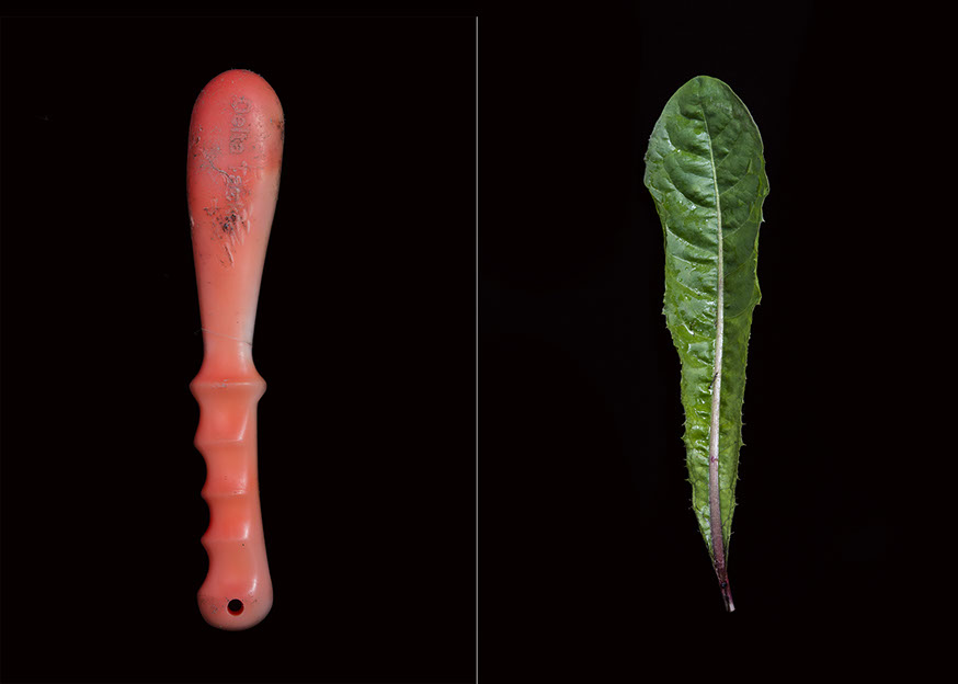 A neon green dish soap bottle is manufactured by the company Lix. Lix is a Vietnamese brand which manufactures cleaning products including dish soap, toilet cleaner, and detergent. A long piece of driftwood has been sanded smooth by the tides. In native Eyak culture in Alaska, driftwood is used to build huts and boats.